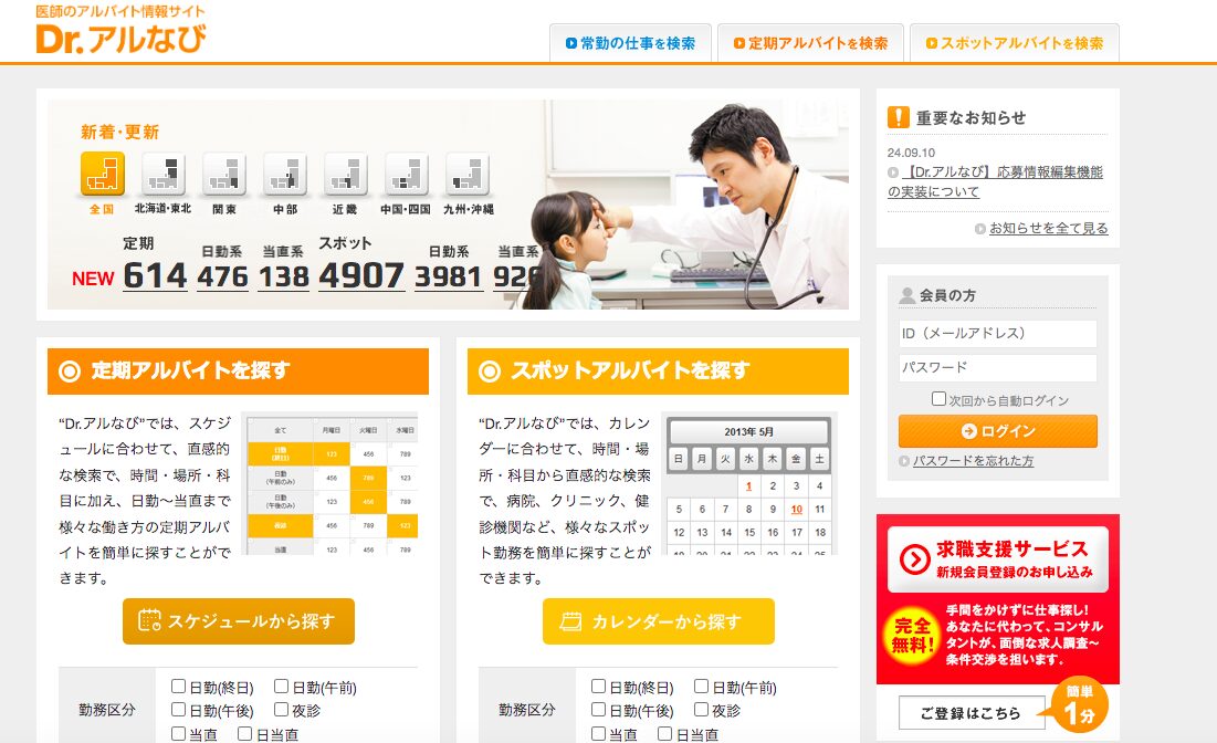 | 注目 | Dr.アルなび | 定期・スポットアルバイトの特化サイトDr.転職なびと並行して使えば最強! | 20,000件 以上 |